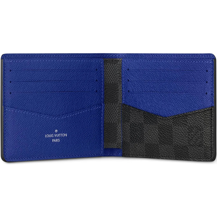 Crafted from the House’s iconic Damier Graphite coated canvas, this wallet showcases a sophisticated gray checkerboard pattern enhanced by a subtle indigo blue cowhide-leather lining. The contrast interior adds a contemporary edge while maintaining timeless Louis Vuitton elegance.